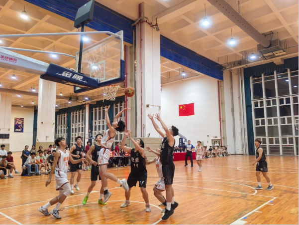 6月12日晚上,学校第十七届体育节之2025年“校园杯”学生篮球赛总决赛在学校体育馆一楼篮球场举行,智能制造学院学生男子代表队和烹饪学院学生男子代表队上演冠亚军争夺赛。校团委、智能制造学院、人文学院、烹饪学院相关负责人和相关老师,各学院学生会指导老师以及300多名学生观看了比赛。