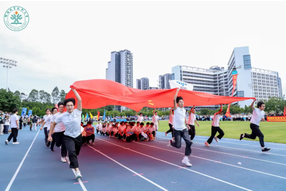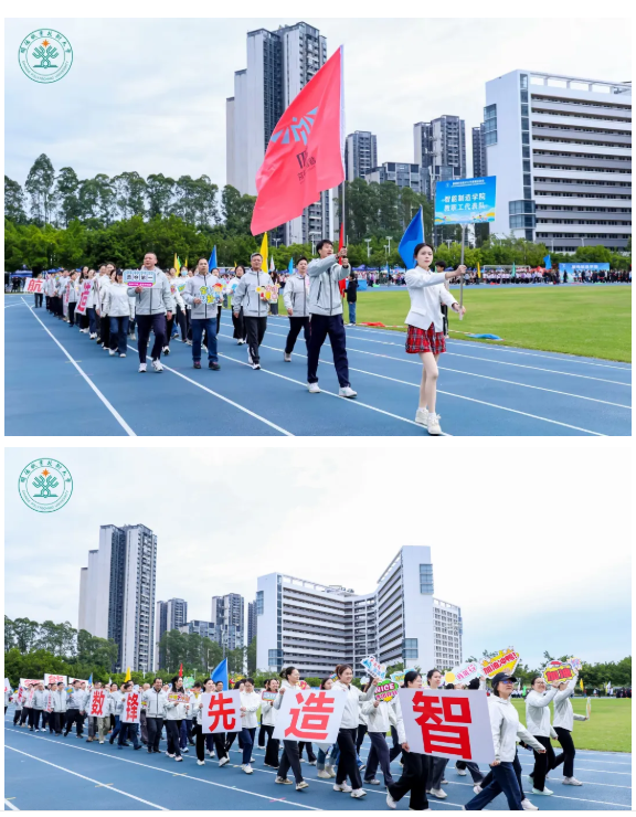 校运会开幕式上,教职工队伍中智能制造学院率先入场,他们手持“智造先锋,数智未来”的标语,步伐坚定有力。这些平日深耕于实验室和课堂的工程师导师们,今天以运动健儿的姿态出现在赛场,诠释着科研严谨与运动激情的完美融合。